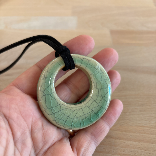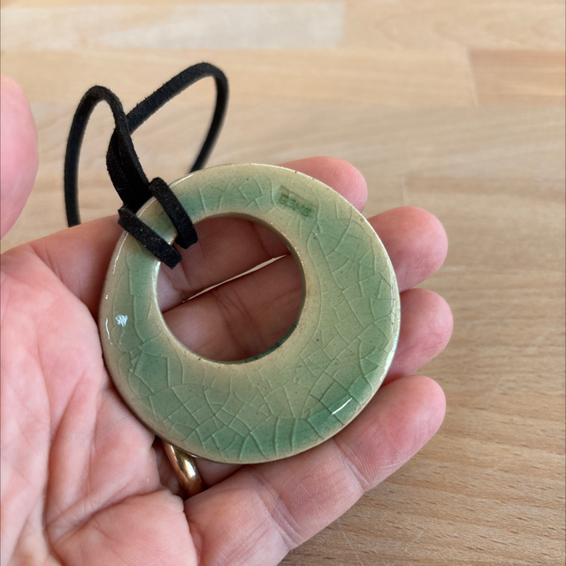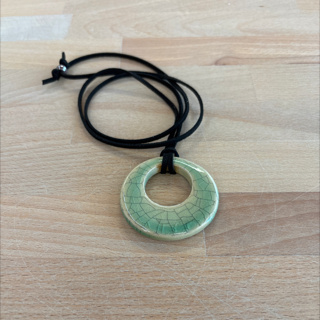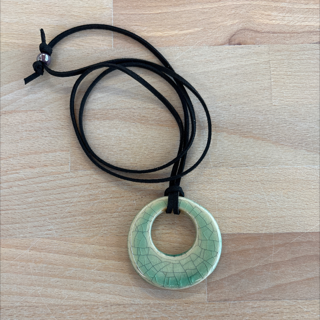 Collana con ciondolo in grès smaltato da entrambi i lati in verde craclé +ink. Cordino in alcantara nero e perline di vetro.