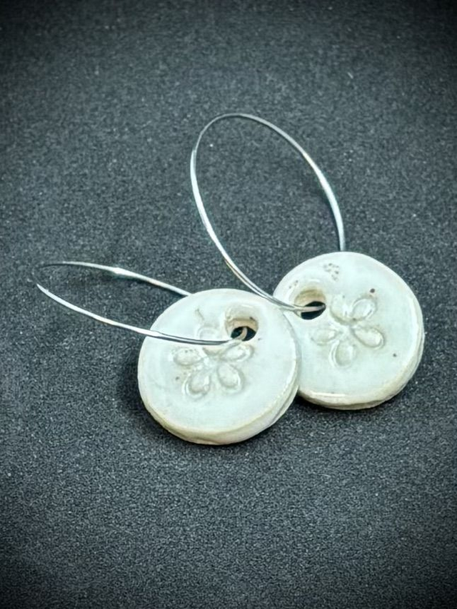 Orecchini in ceramica grès smaltato bianco/panna, creola acciaio inossidabile 25mm