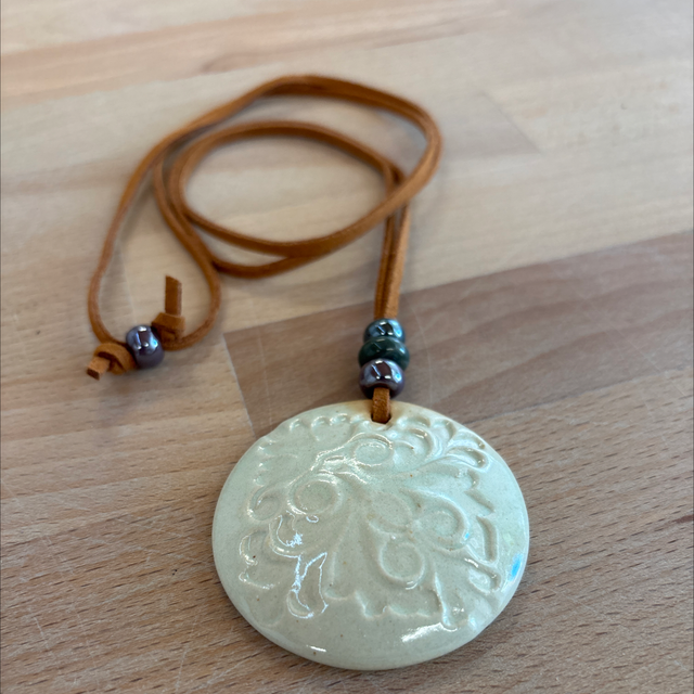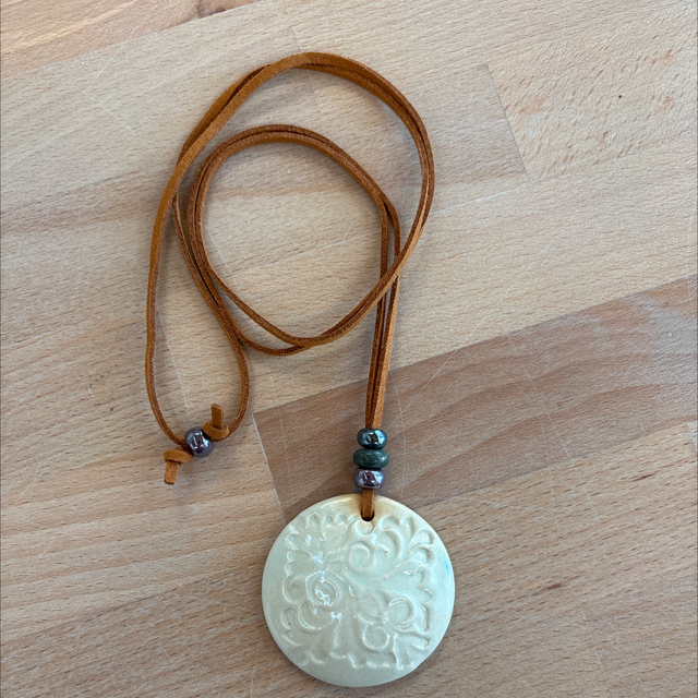 Collana con ciondolo in grès smaltato, cordino in alcantara e perline di vetro.